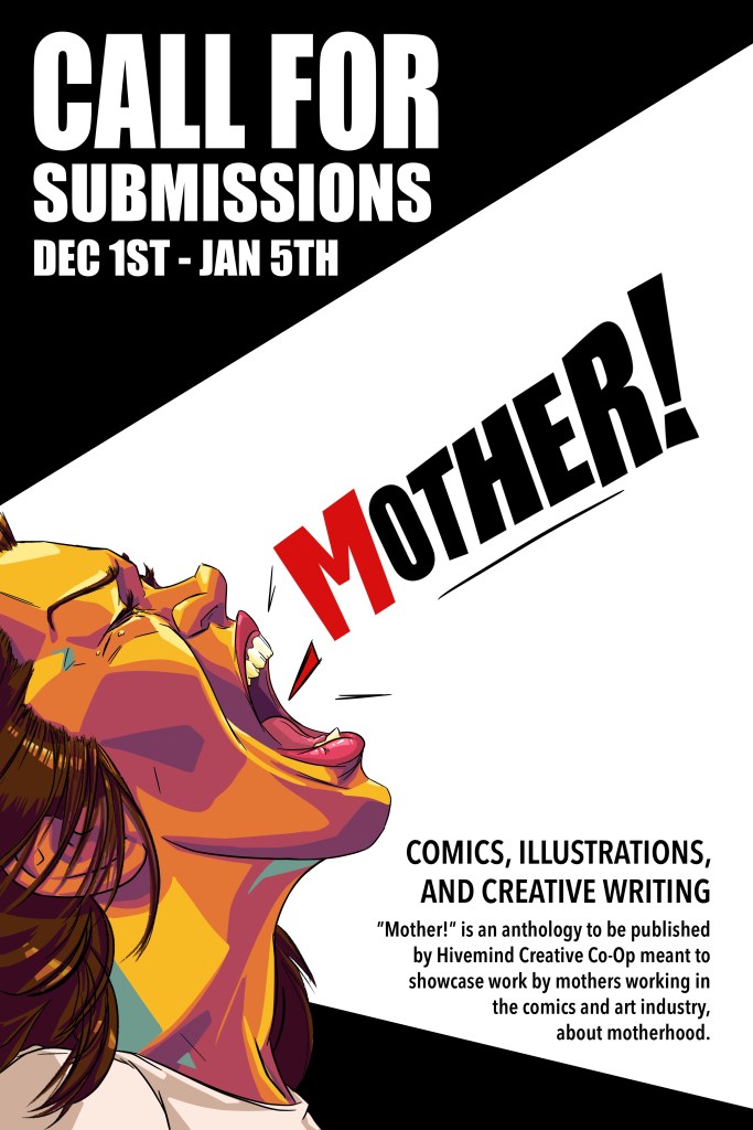 ”Mother!” Is an anthology published by Hivemind Creative Co-Op meant to be produced by mothers working in the comics and art industry about motherhood. We seek to help mitigate the chronic under employment of mothers and offer an opportunity exclusively to them to tell their stories and place their foot firmly into or back into the industry.